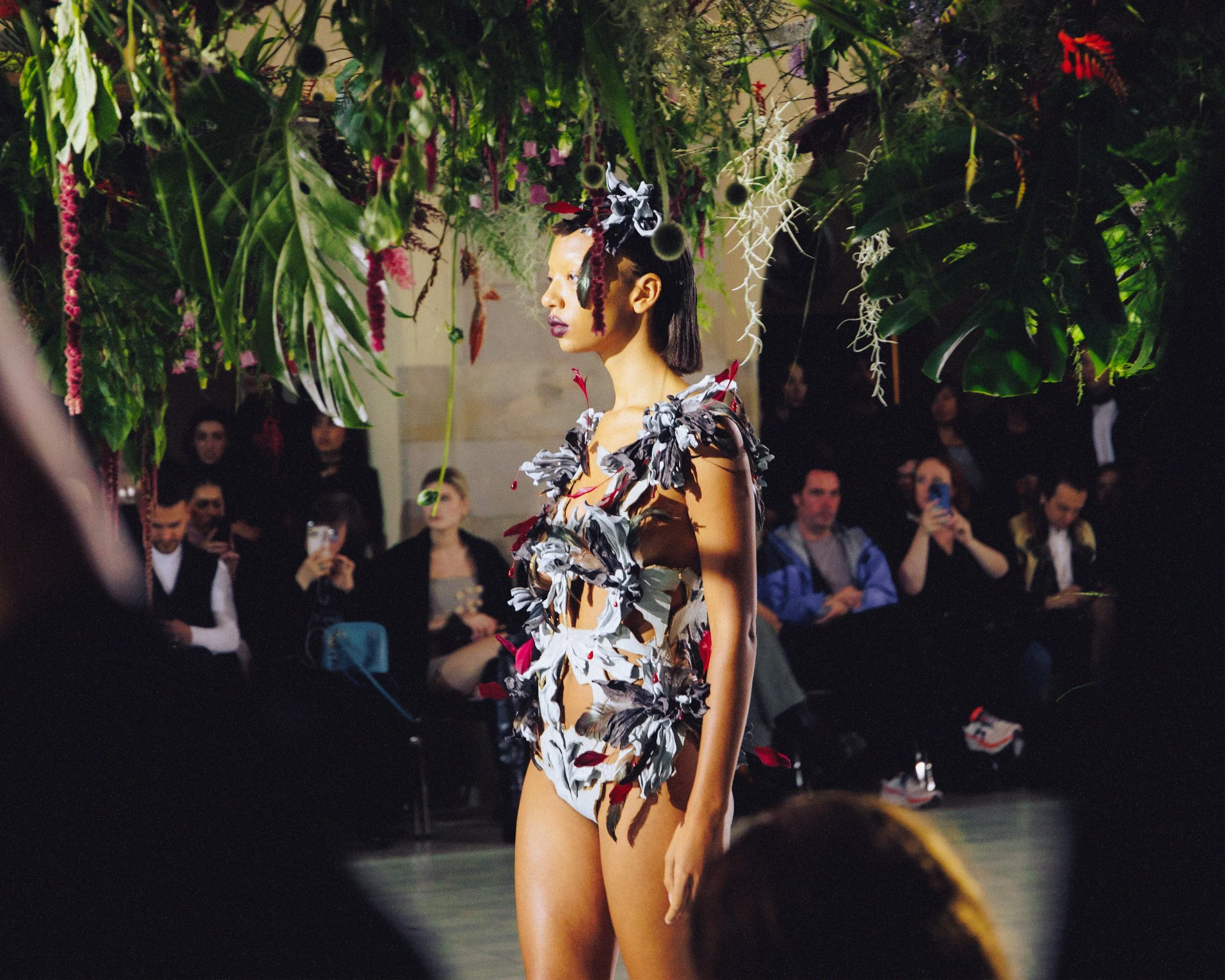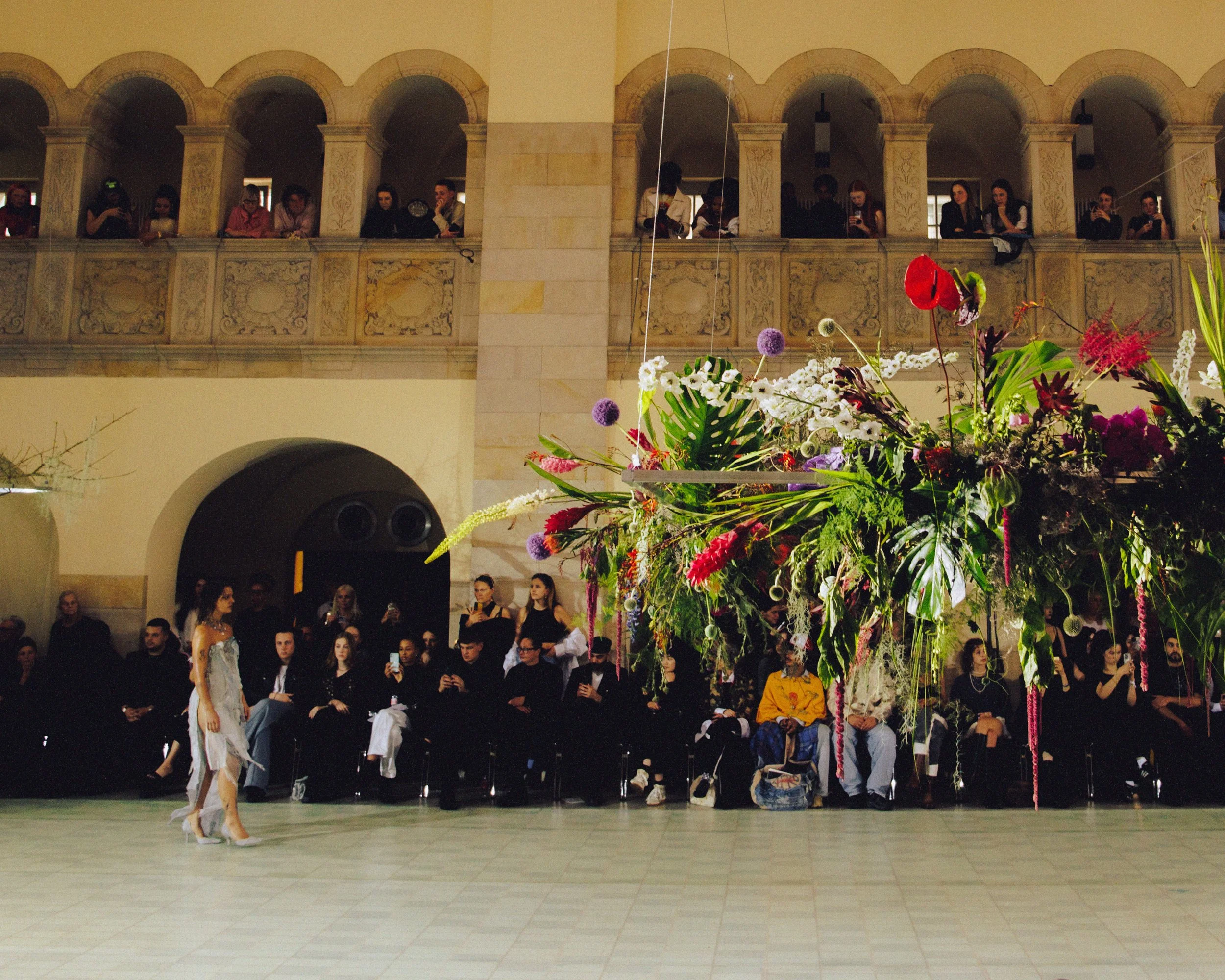 The “Garden of Earthly Delights” was embodied in our runway design, with hanging aluminium frames and a glut of cut, foraged and living plants.