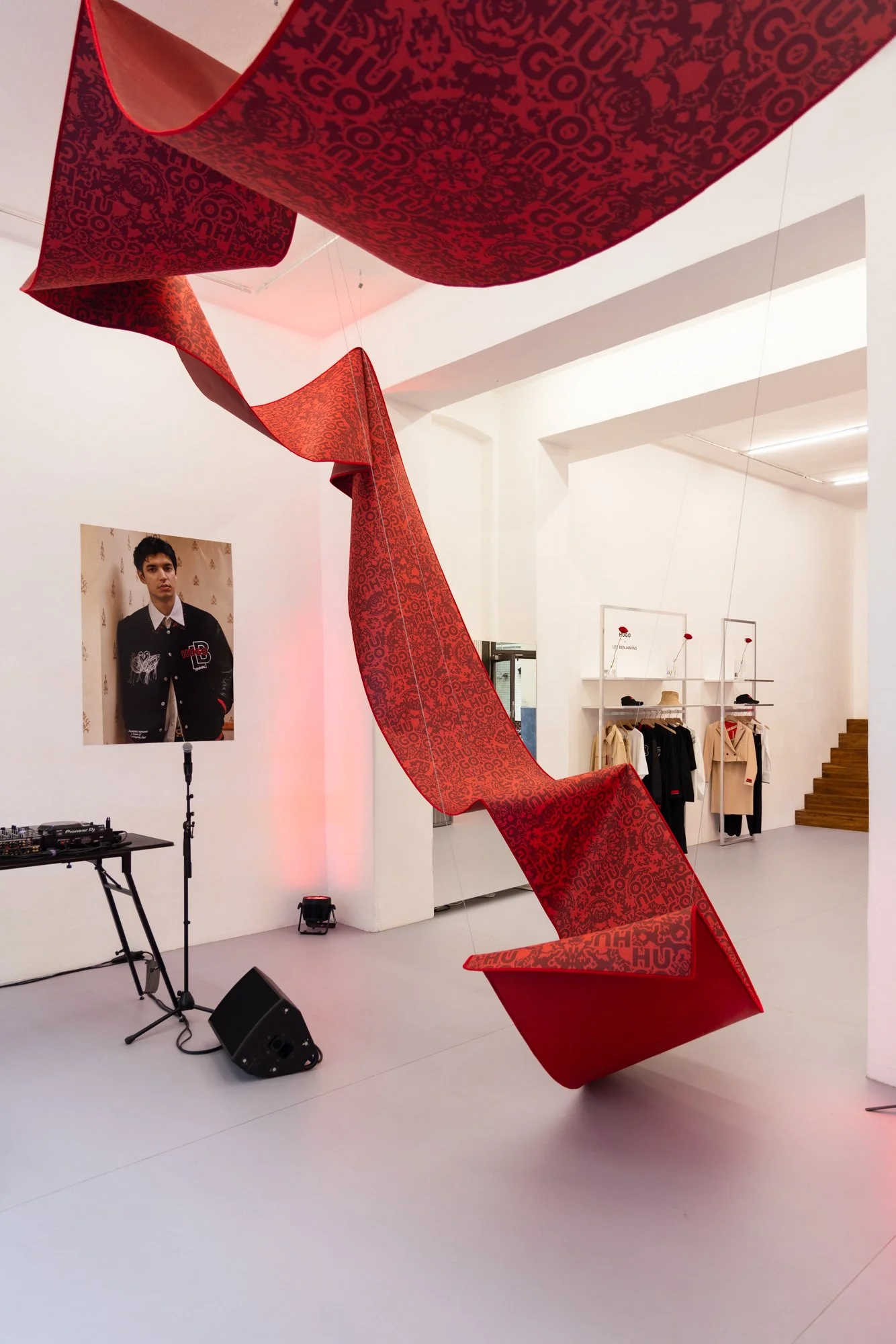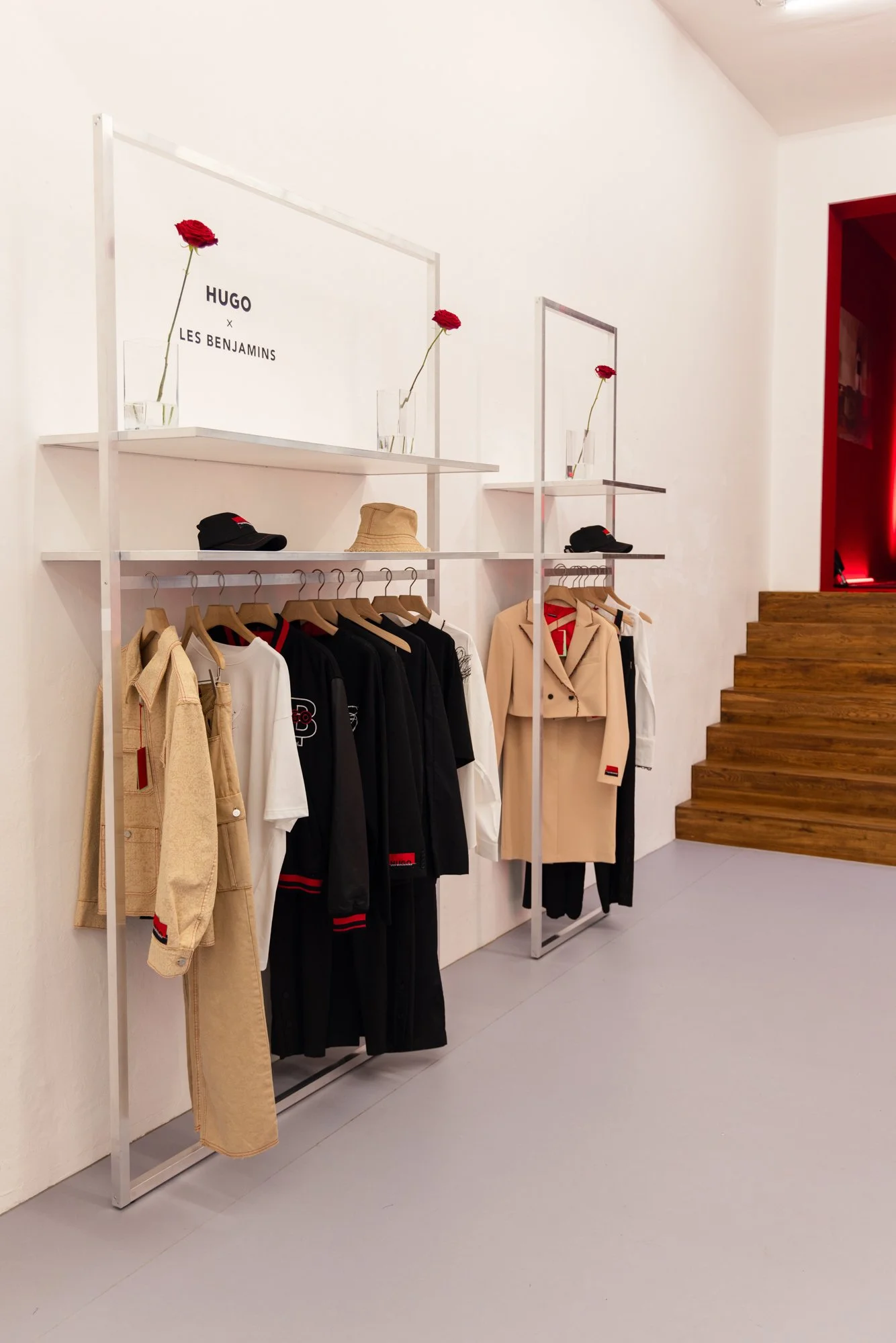 For this event, we transformed Voo Space on Oranienstraße, with a custom printed flying carpet, large scale prints from the Hugo Boss x Les Benjamins campaign, and a red painted room in the back. Roses and custom clothes hangers and graphics elevated the space with simplicity and shiny chrome.