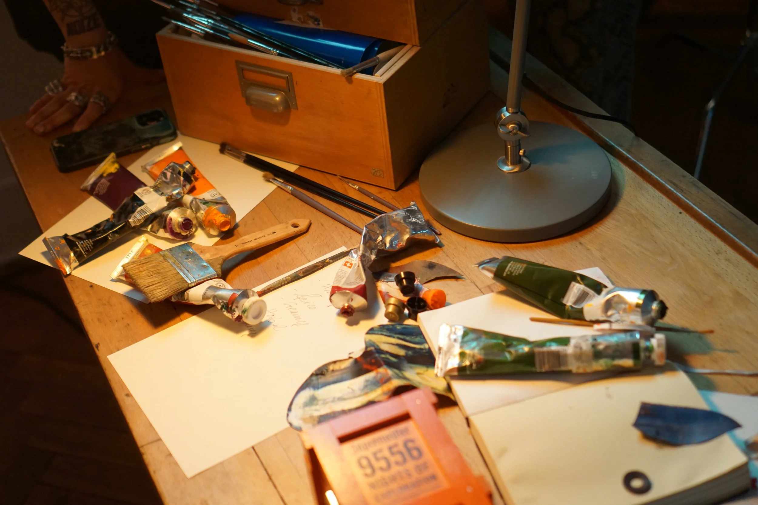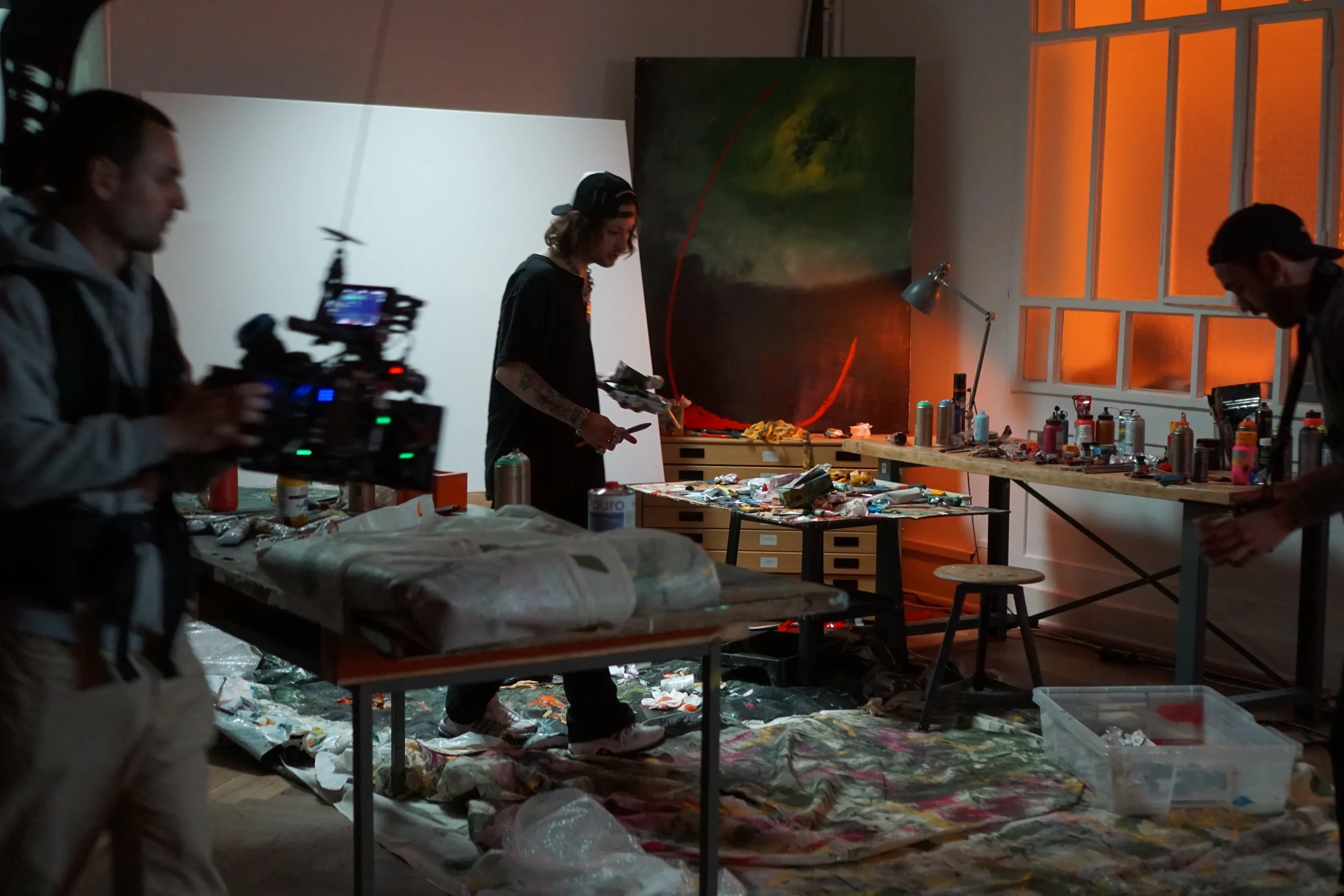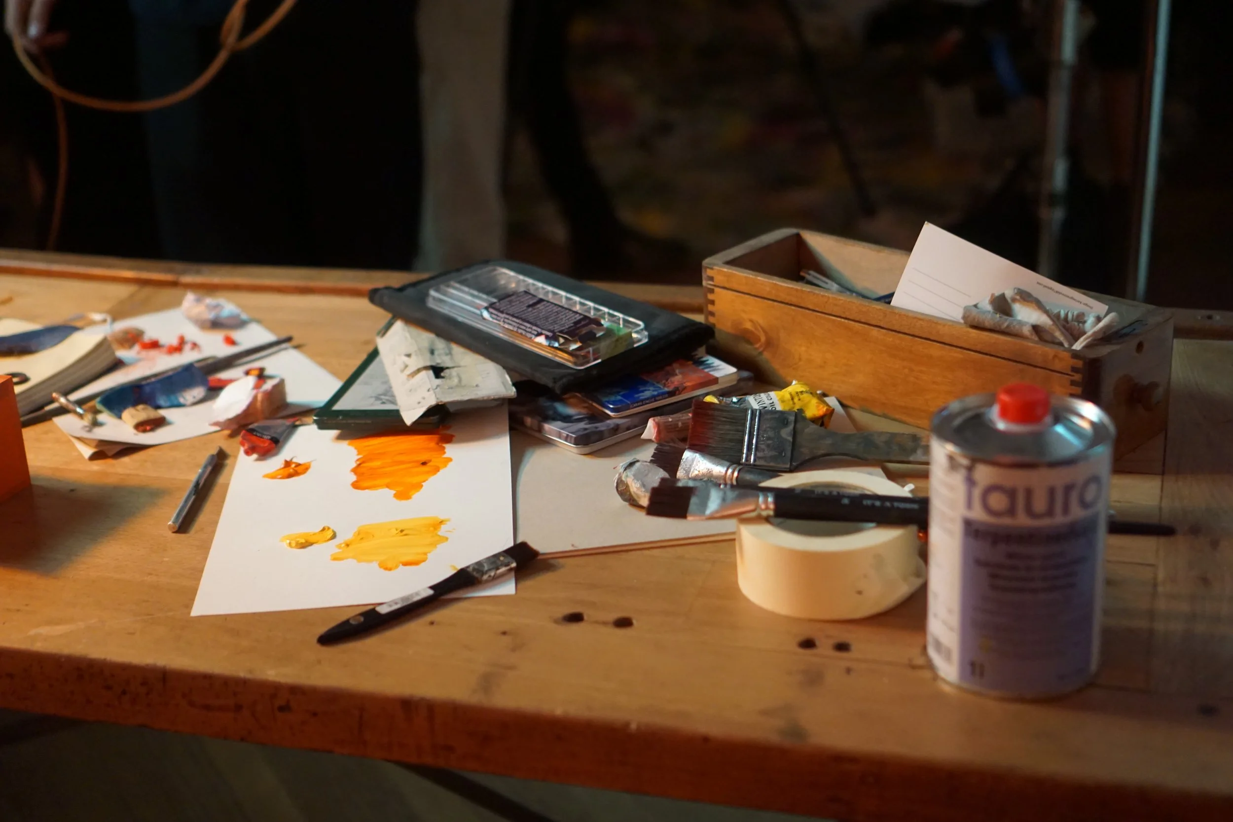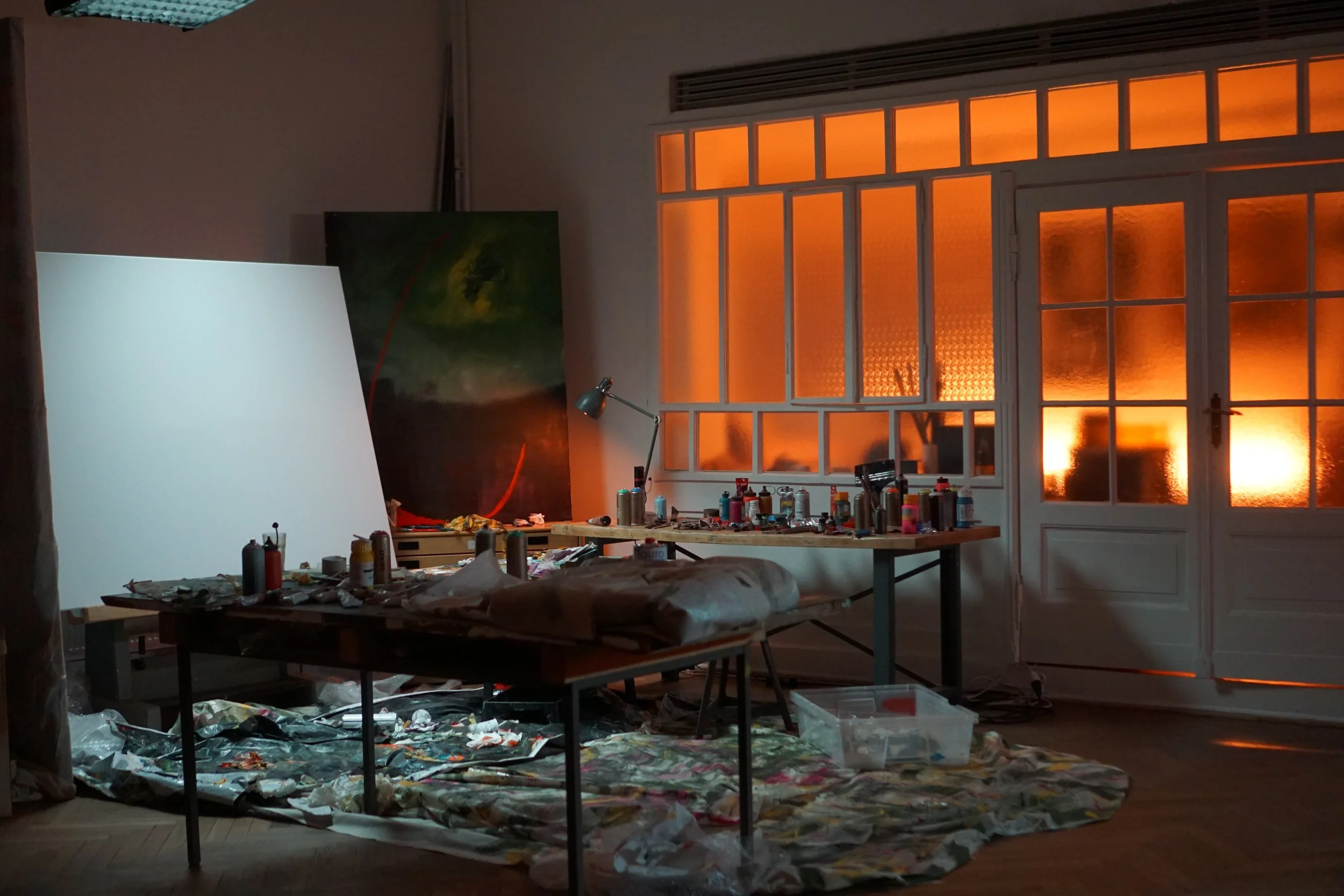 Creating a lived-in painter’s studio, with dried oil paints, used drop sheets & painter’s tools for Mago Dovjenko x Jagermeister.