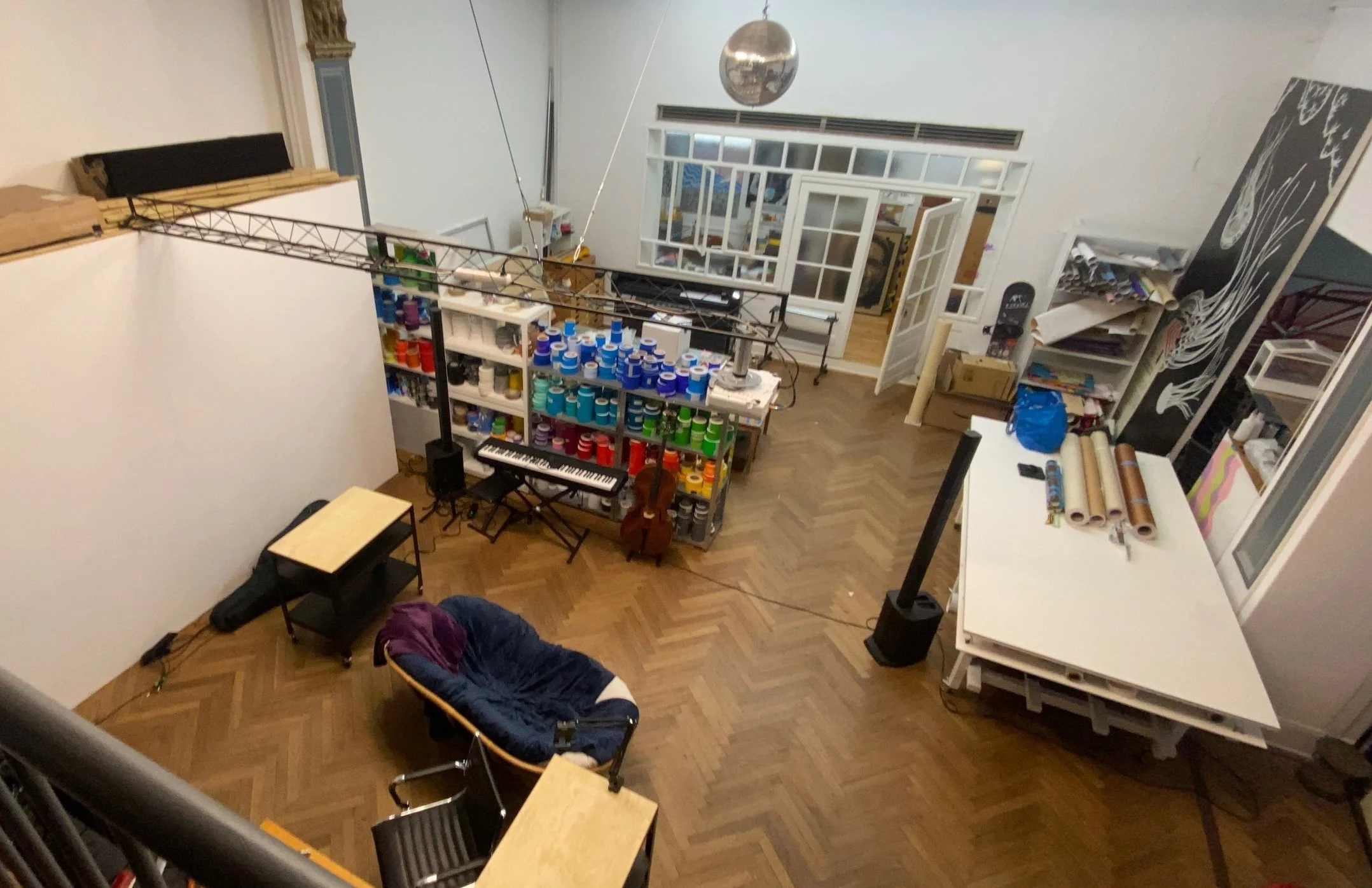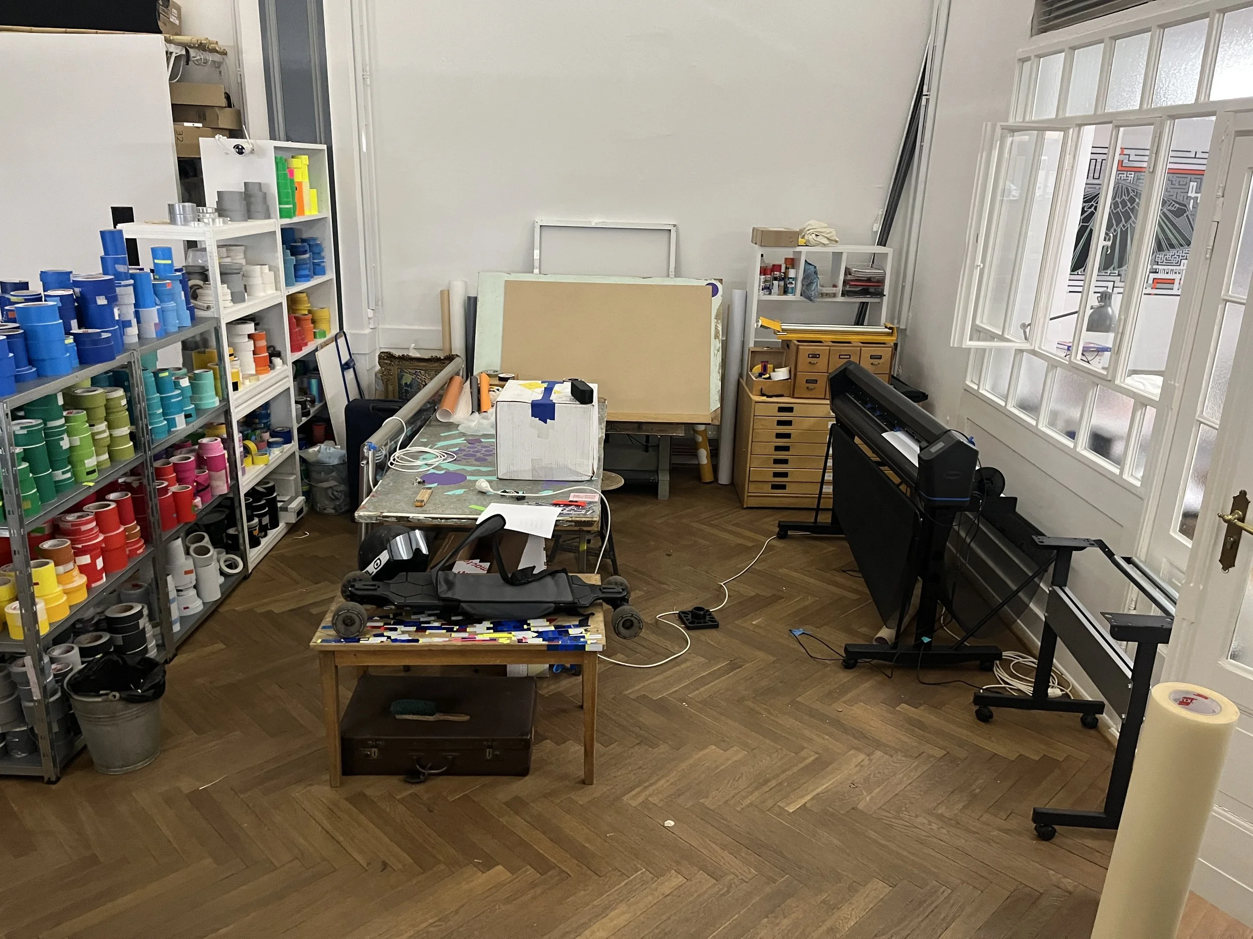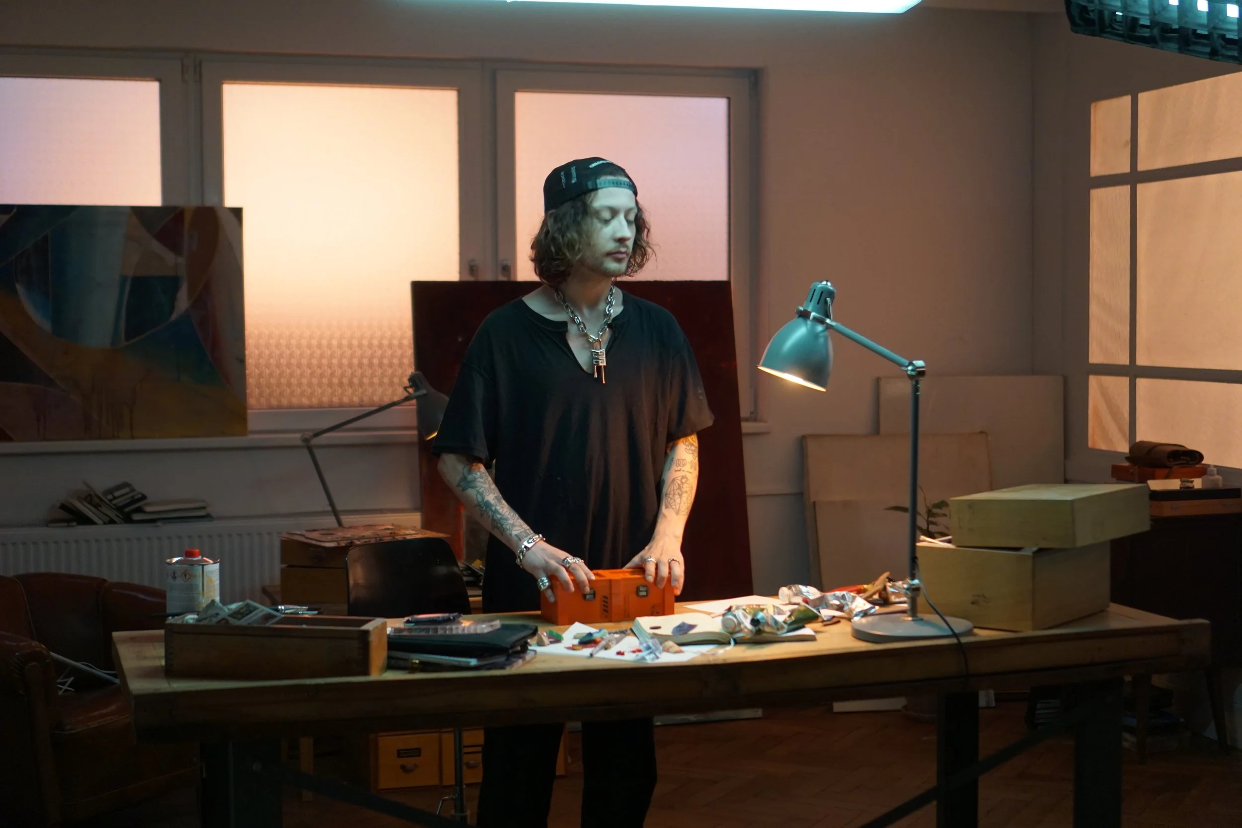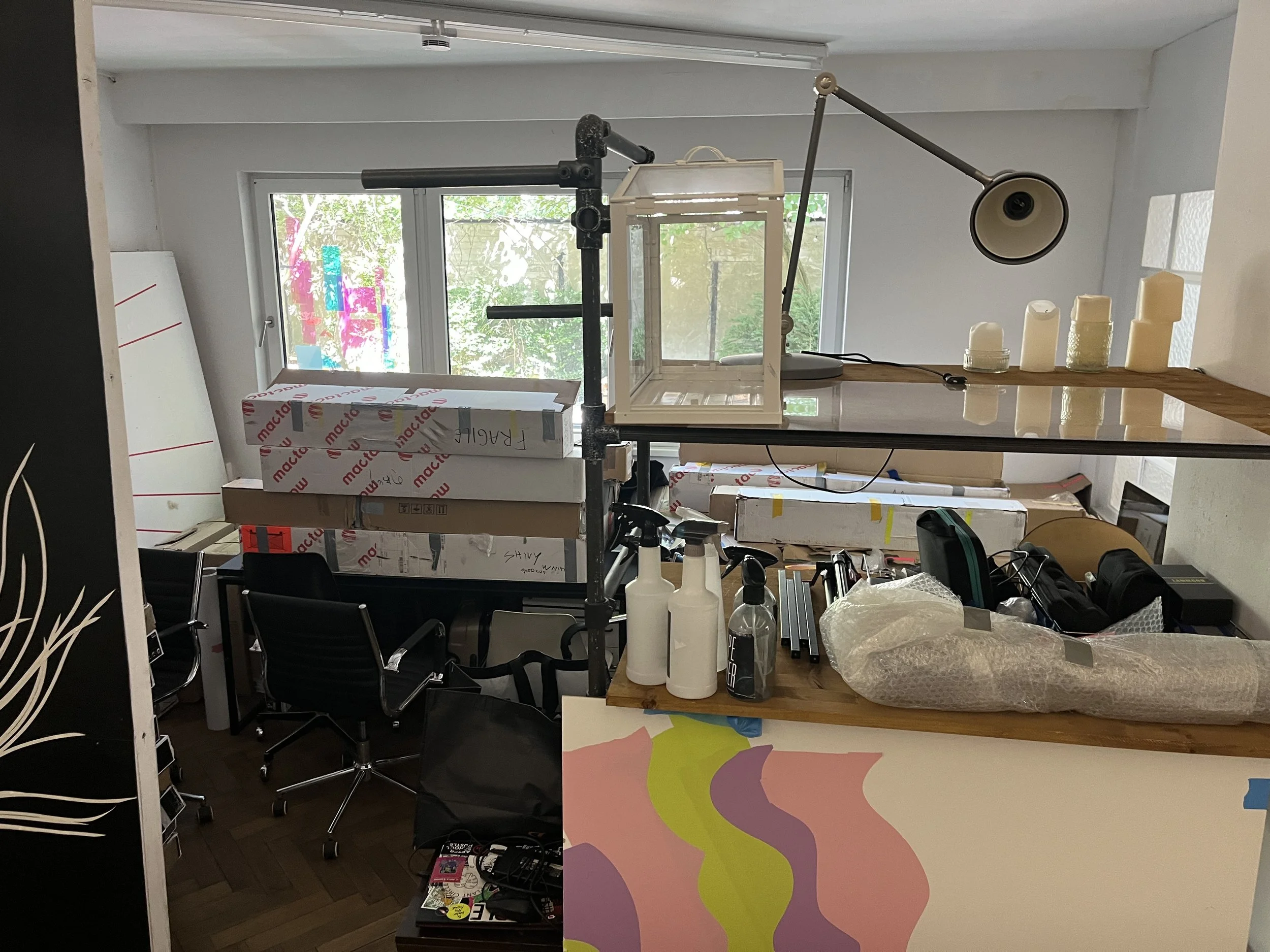 Creating a lived-in painter’s studio, with dried oil paints, used drop sheets & painter’s tools for Mago Dovjenko x Jagermeister.
