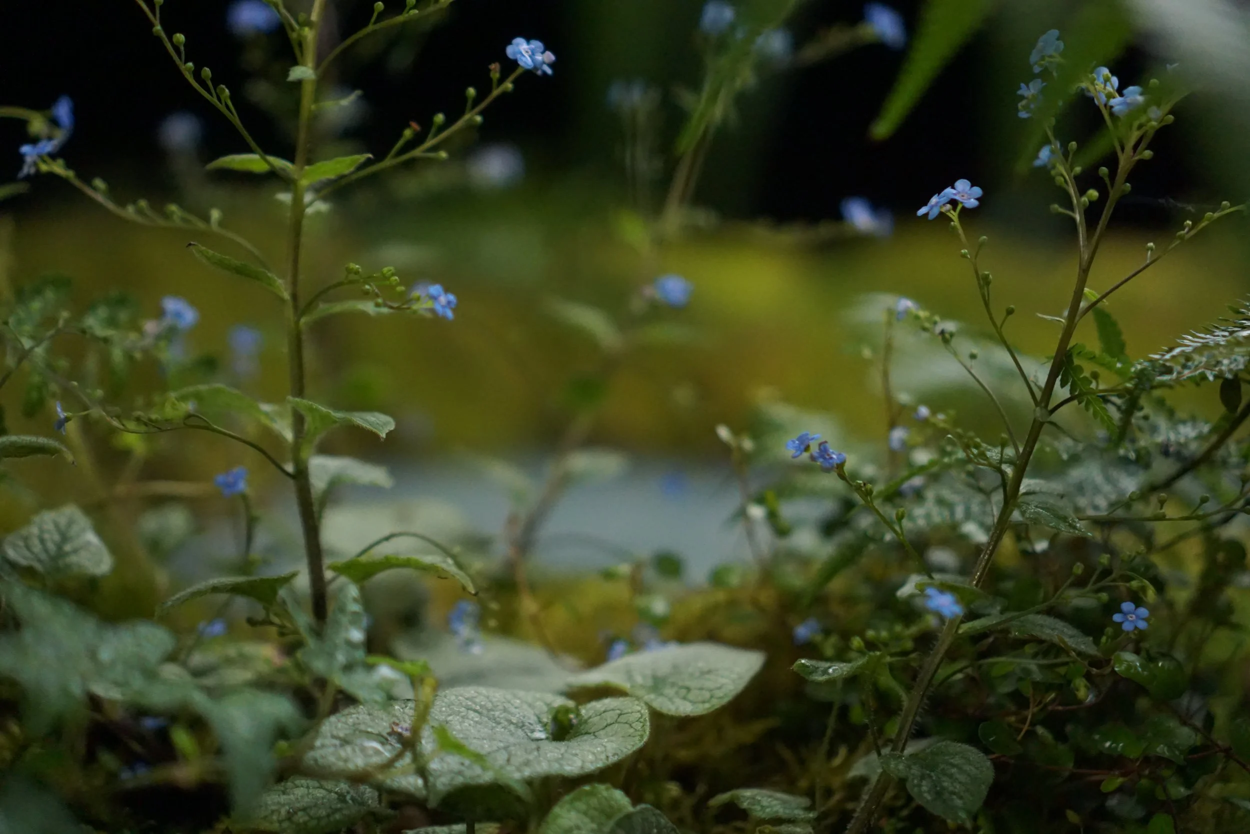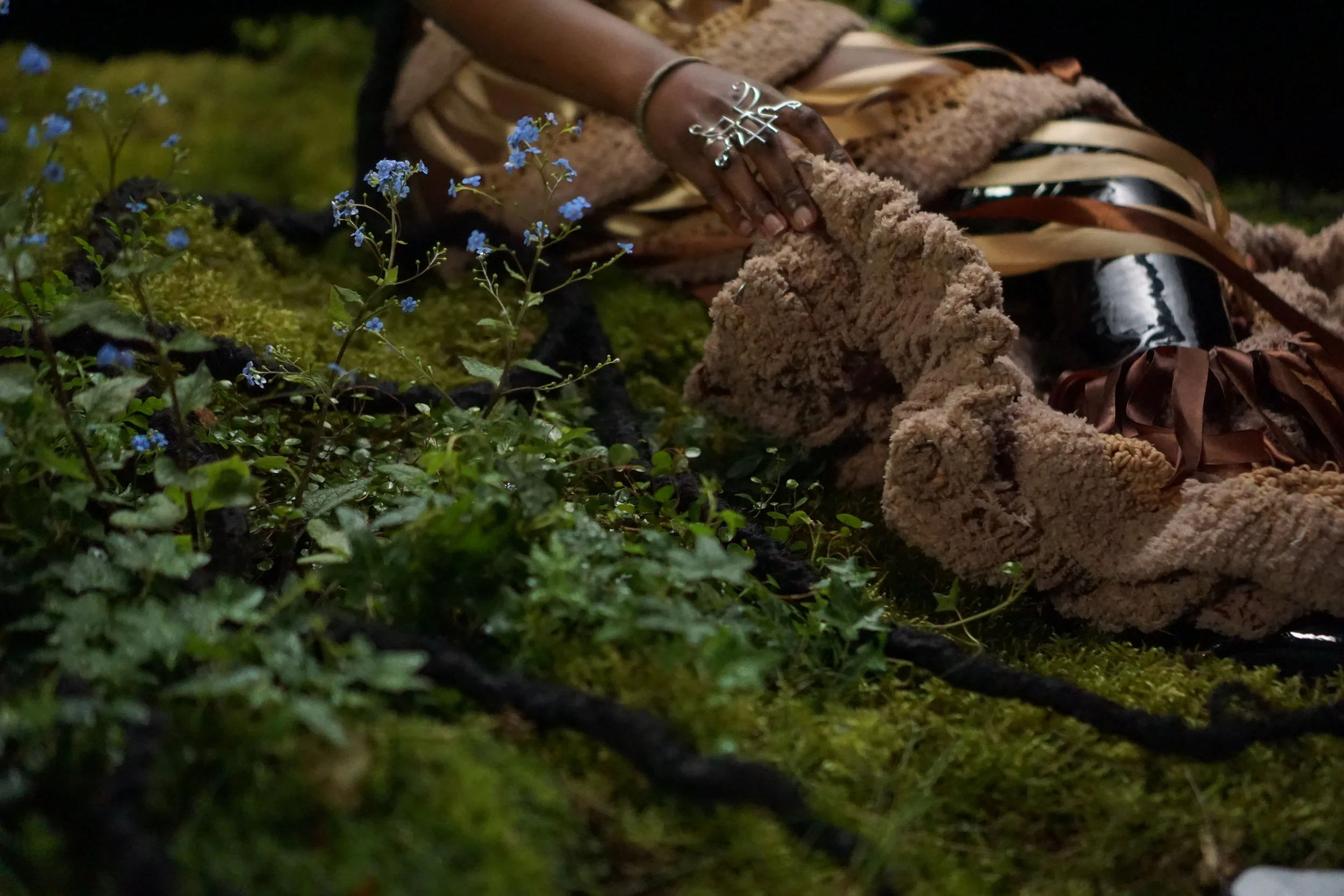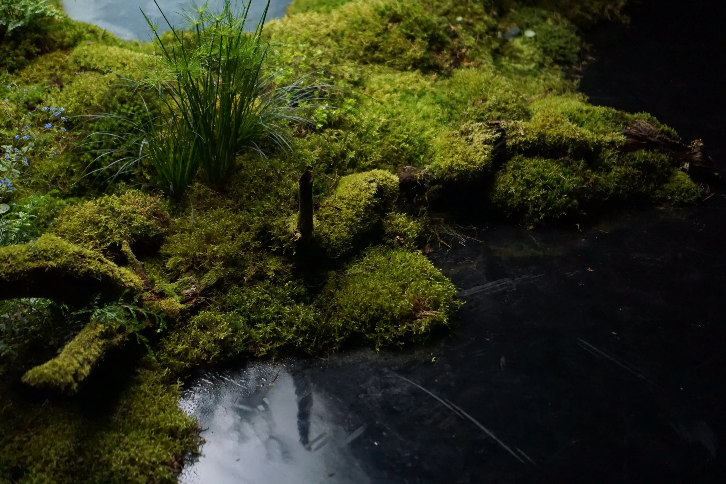 A whimsical, ominous landscape with a palette of moss, wildflowers and ferns.